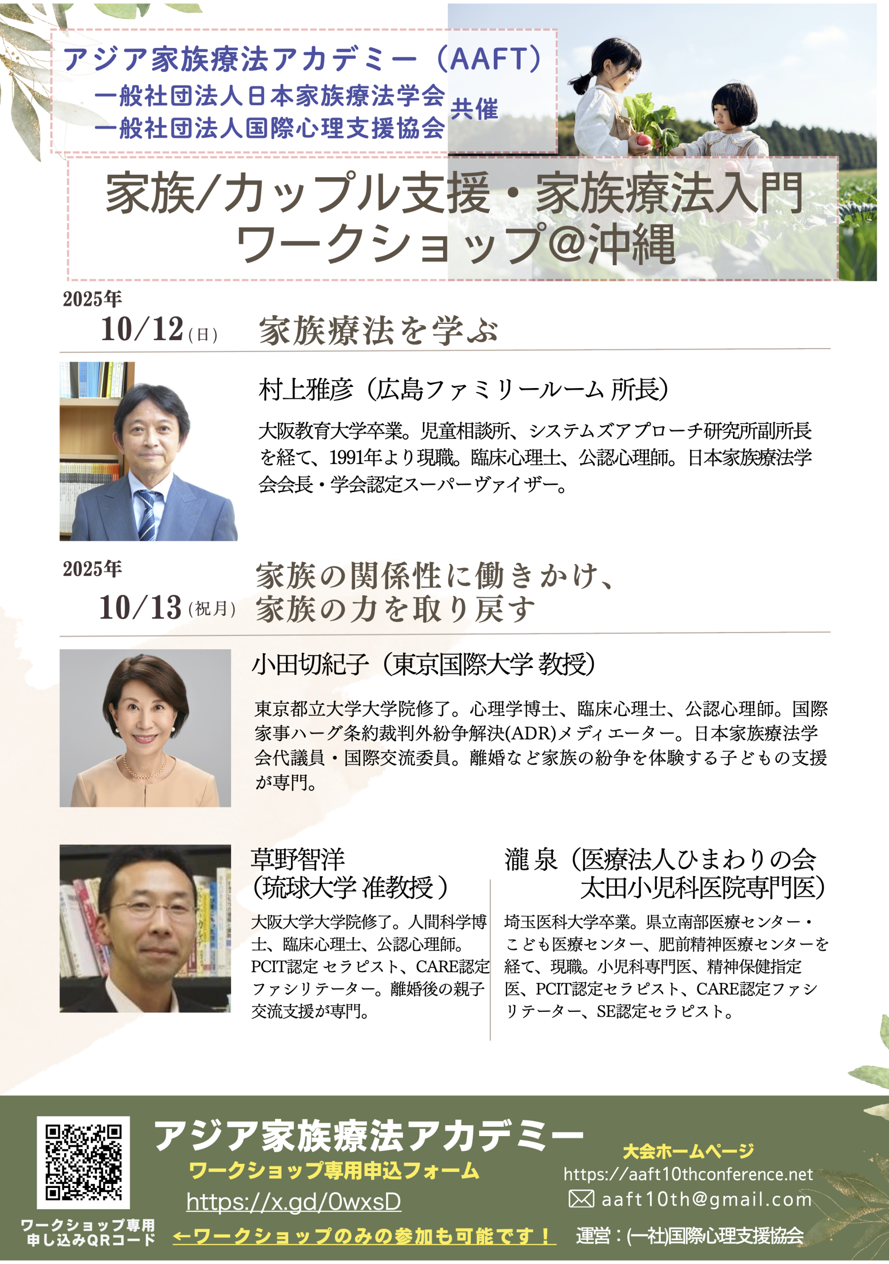2025.09.18 イベント家族療法を学ぶチャンス!沖縄で開催される特別研修のお知らせこんにちは、BowLスタッフの大田です。今日は、支援に関わるすべての方におすすめしたいイベントをご案内します。2025年10月、沖縄で「第10回アジア家族療法学会」が開催されます。沖縄で家族療法の国際大会が開かれるのは珍しく、国内でこれほど大規模な学びの場に触れられるのは、まさに貴重な機会です。